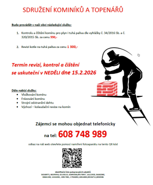 Sdružení kominíků a topenářů bude provádět v naší obci v NEDĚLI dne 15.2. požadované kontroly a čištění komínů pro plyn i tuhá paliva dle zákonu č. 34/2016 Sb.