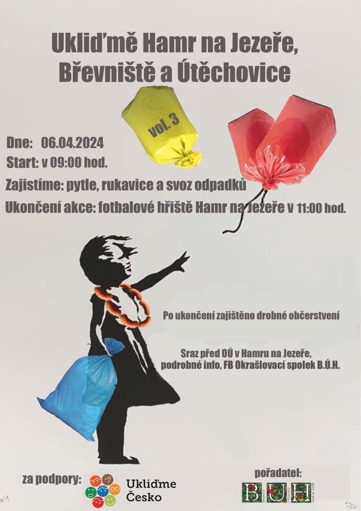 Již tuto sobotu : Ukliďme Hamr! V 9 ráno sraz před Obecním úřadem, v Břevništi u točky autobusů. Budeme se těšit!váš okřašlovací spolek B.Ú.H..